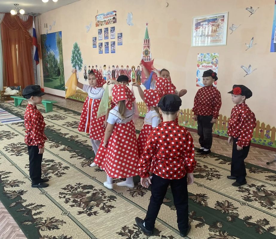 В рамках года единства народов России и с целью приобщения детей к русской народной культуре и духовному наследию России в разновозрастной группе №3 под руководством воспитателя Сурковой А.А. прошло фольклорное развлечение по краеведению "Путешествие в страну Фольклора". Ребятишки получили письмо от дедушки Фольклора, который пригласил их в гости. В нарядных костюмах молодцы и красны девицы отправились в путешествие в страну Фольклора. По дороге они водили хоровод "На горе- то калина", отгадывали загадки, сочиняли рифмы, шутки- прибаутки, пели частушки, песню "Во кузнице", играли в "Золотые ворота", а потом в пляс пошли. В конце путешествия их встретил дедушка Фольклор и угостил своих гостей сладостями. Развлечение прошло весело и интересно.